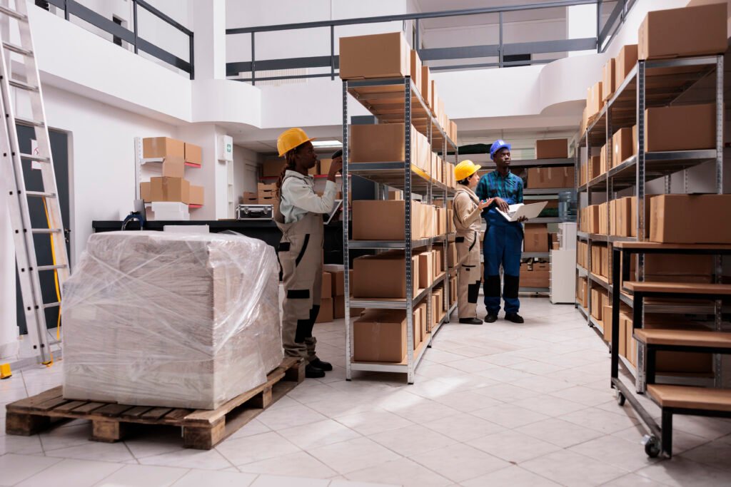 African american and caucasian warehouse workers scanning parcels barcodes and making inventory. Diverse delivery service storage employees team wearing uniform working in storehouse
