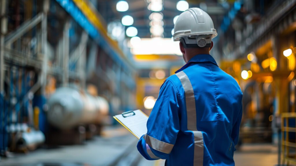 An engineer in a blue uniform with a safety helmet is inspecting a petrochemical plant with a clipboard in hand, surrounded by intricate metal structures and pipelines