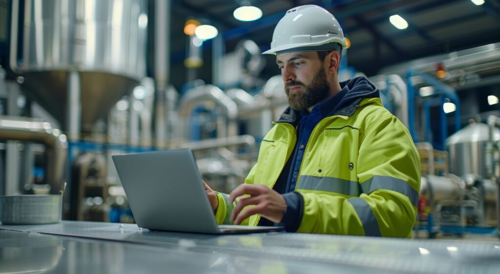 A focused engineer wearing a high visibility jacket, hard hat, and safety glasses using a tablet to perform an inspection in an industrial factory setting. The image conveys safety, technology, and industry.